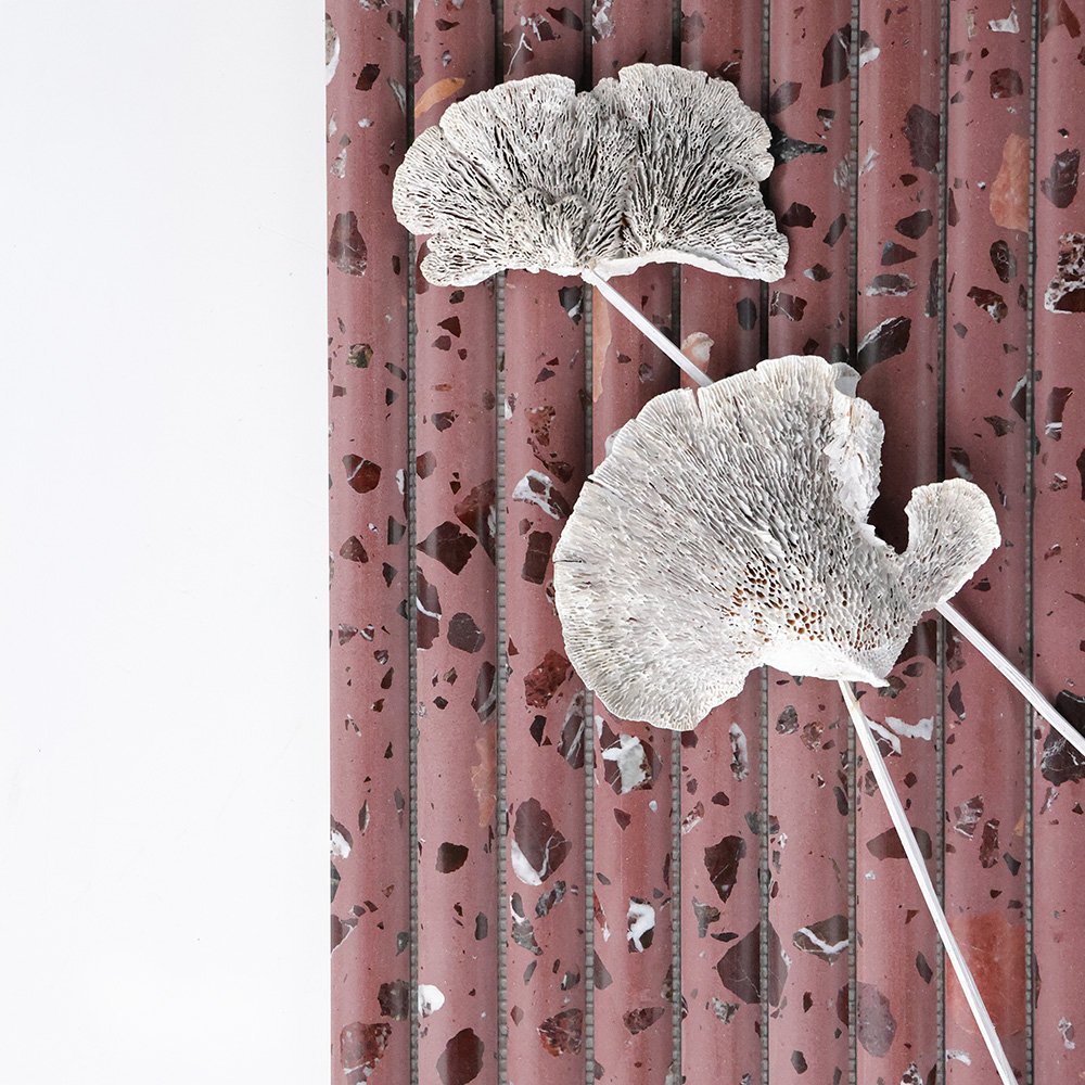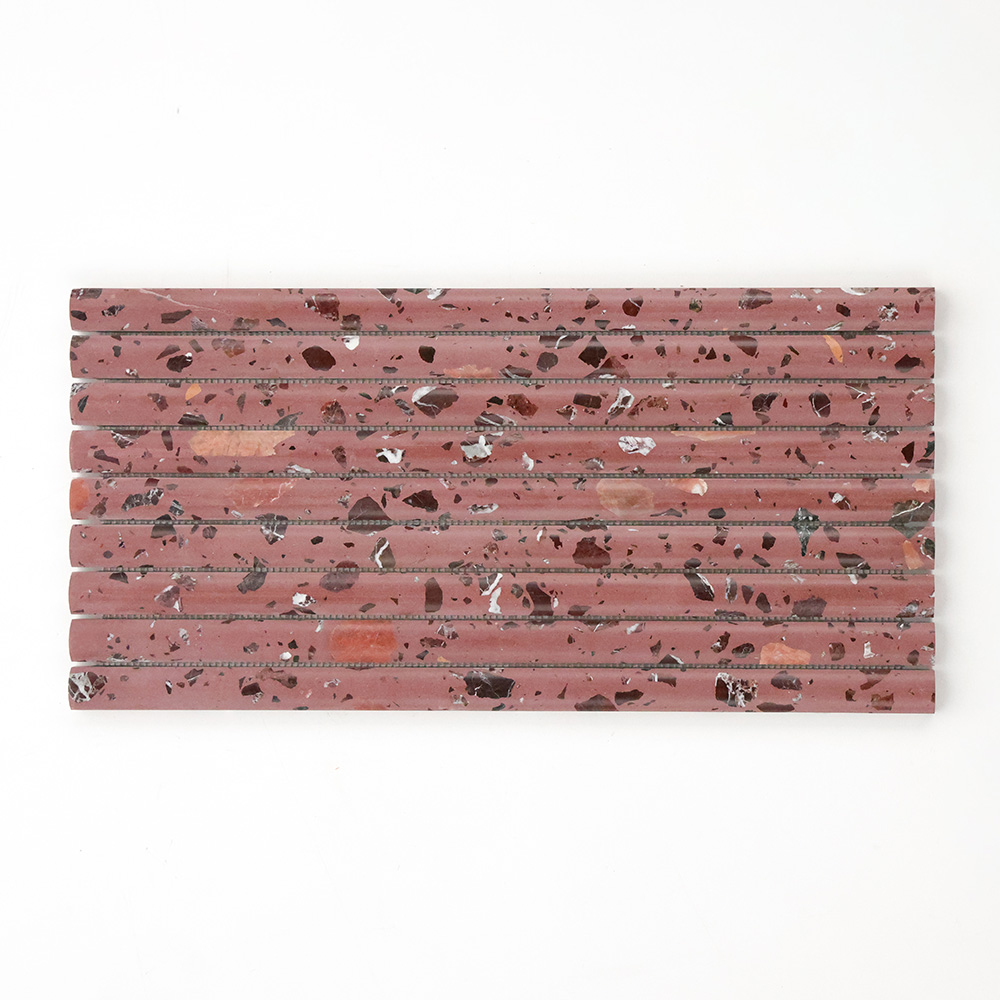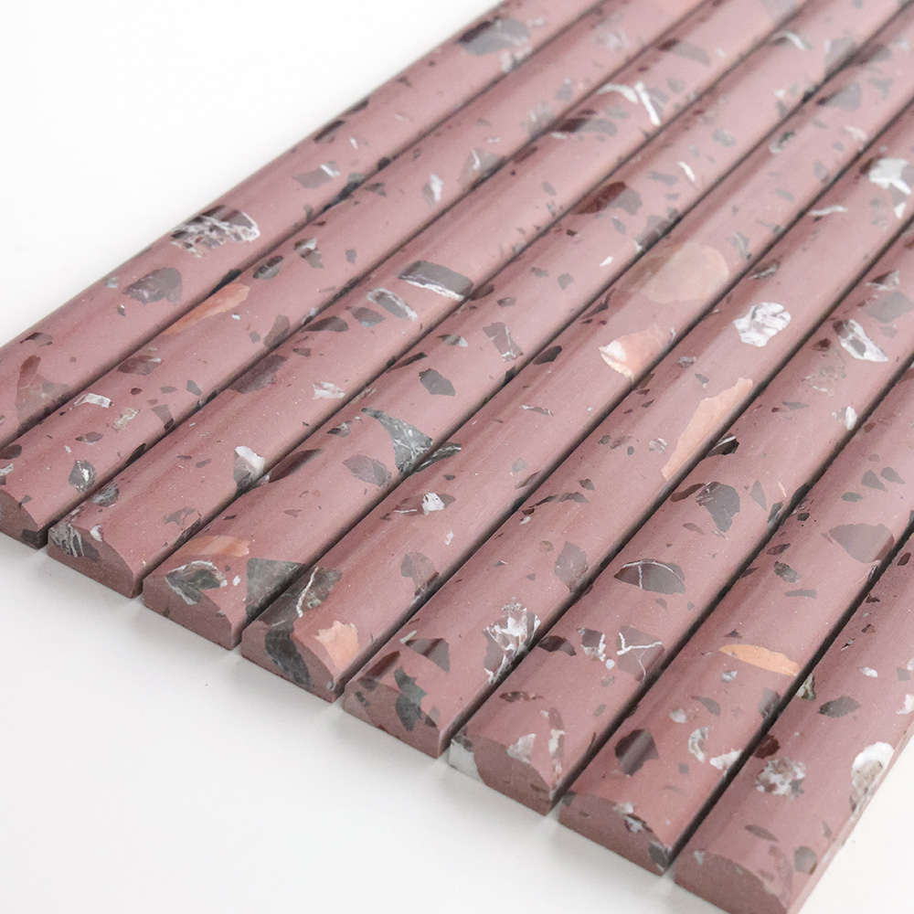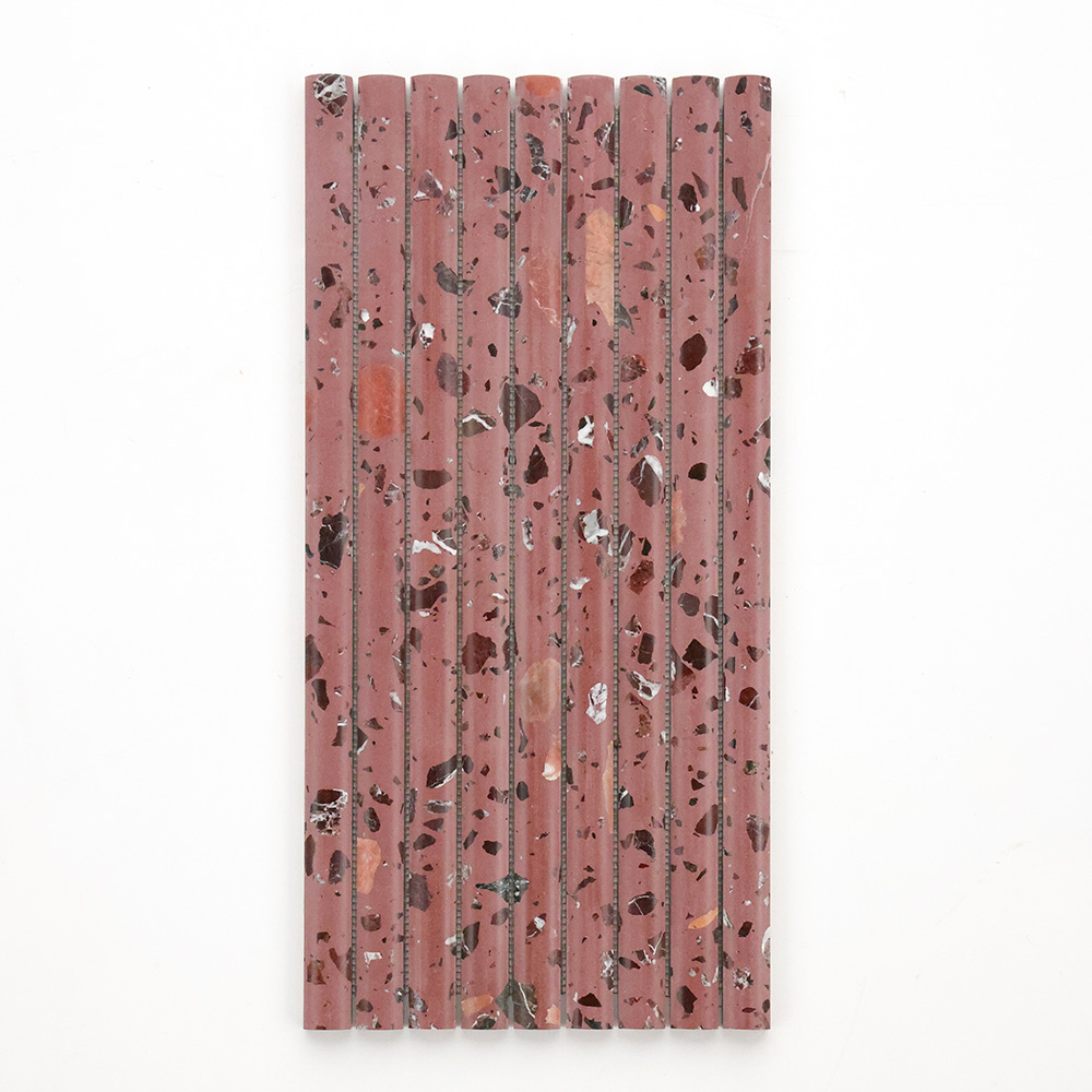Terazzeri features dimensional mesh-backed sheets and large format leathered field tiles. Each piece is filled with natural marble, granite, and other recycled stone. Every tile showcases its own unique tones, texture, and variation.